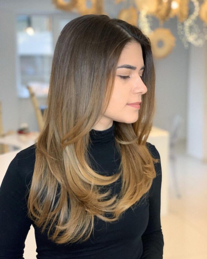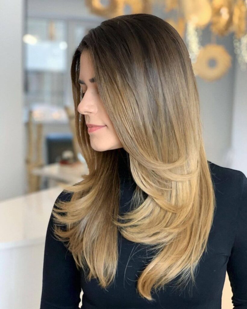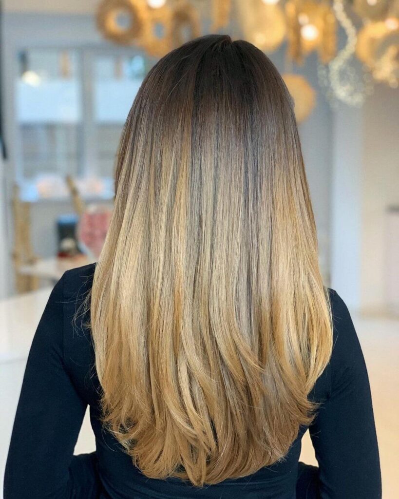 Tehnica de vopsit Ombre pe părul drept se focalizează pe tranziția culorii. Stilistul poate evidenția doar anumite zone sau poate opta pentru o decolorare care începe la nivelul lungimii medii. Această a doua opțiune arată bine pe părul lung, așa cum vezi în fotografia de mai jos.