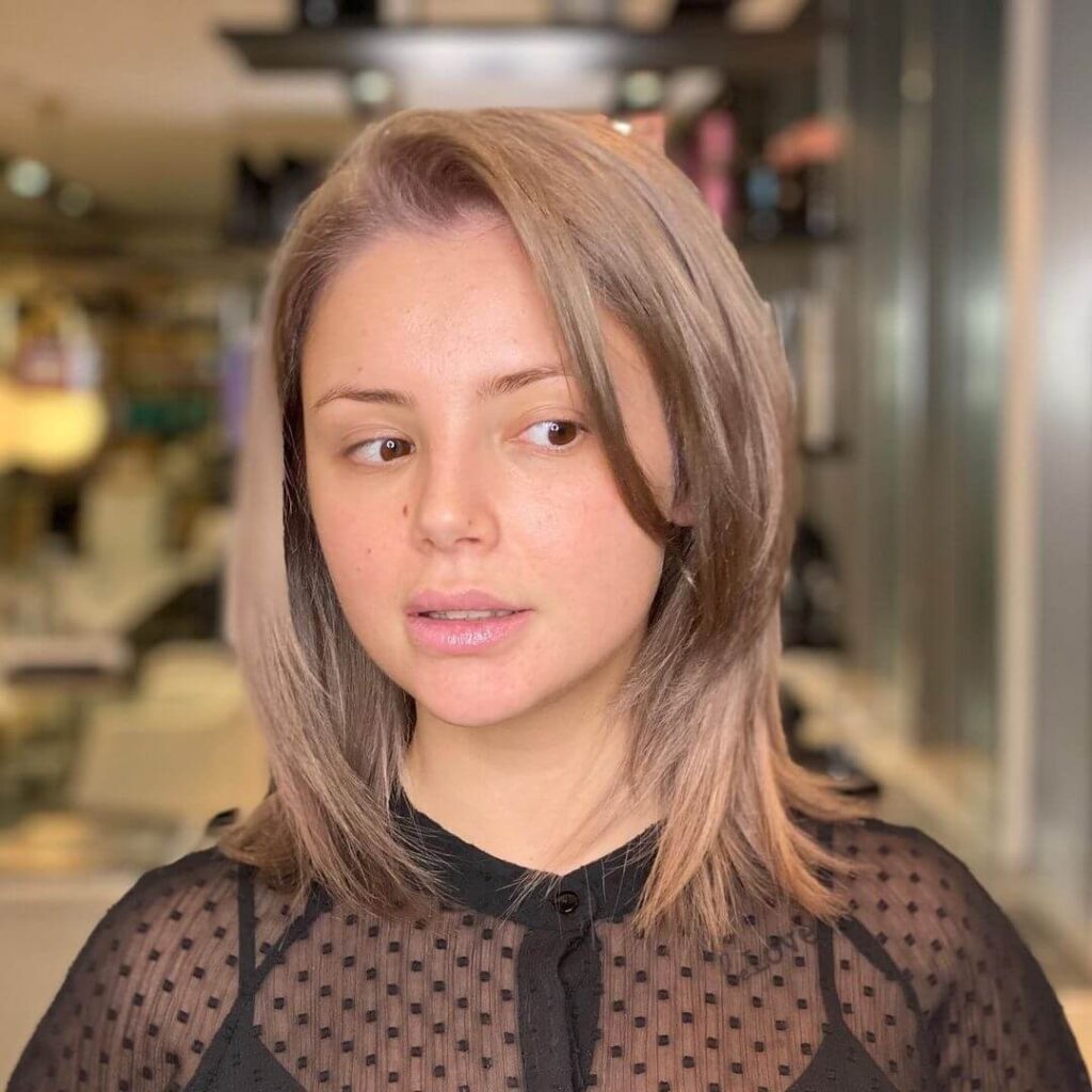 Cele mai răspândite tunsori de lungime medie pentru fețele rotunde sunt boburile cu trese frontale mai lungi și cut stratificat pentru că îți oferă cele mai bogate opțiuni de styling. Cea mai potrivită lungime pentru fețele rotunde este până la umeri (sau puțin mai lungă) pentru că alungește. Marginile texturate sunt un plus. Fruntea poate fi acoperită cu breton asimetric.